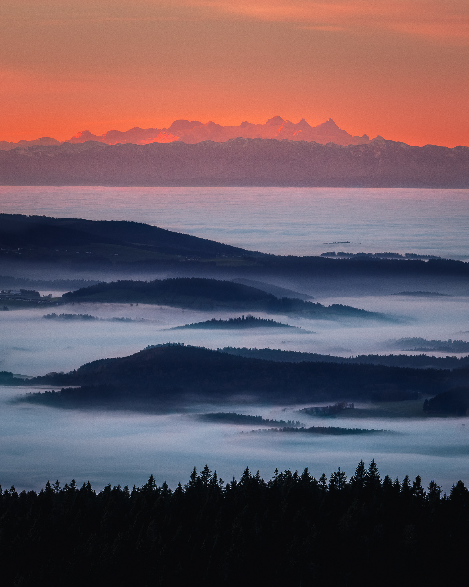 Na začátku léta jsem si pořídil ohnisko 70-200 a už tenkrát jsem si pomýšlel na lepší pohled na Alpy z vrcholu Plechý. Přišel podzim a já jsem den před vyfocením téhle fotky byl na východ slunce na nové rozhledně v Horní Plané. Alpy jsem viděl už to ráno, ale byla to prostě strašná dálka! A tak jsem to hecnul další ráno znovu a vyrazil po hřebenu z Třístoličníku na Plechý. Klasicky jsem nestíhal, ale východ vypadal slibně. No, nakonec úplně tak vymazlenej nebyl, ale měl jsem štěstí na první paprsky, které osvítily vrchol Dachstein a tak mám konečně ve sbírce fotku, kterou jsem si vždycky přál.