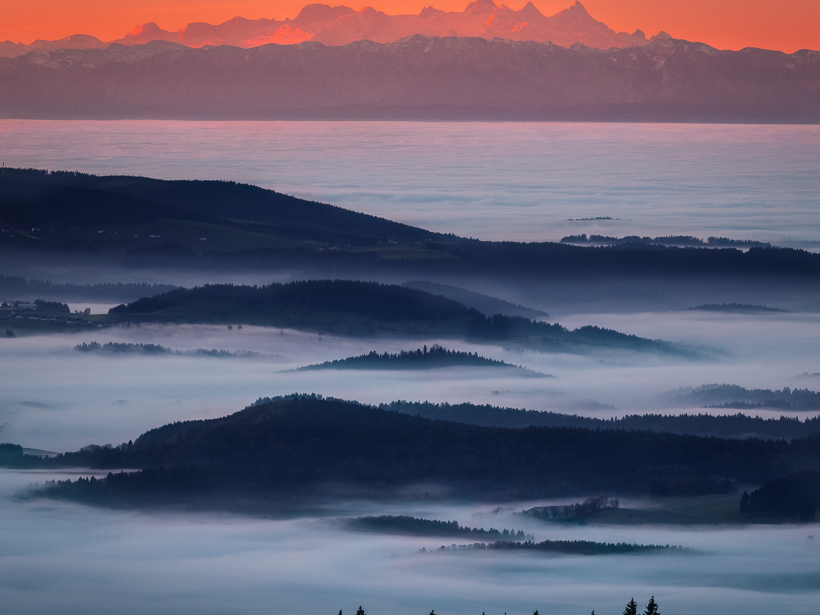 Tato fotka vznikla během listopadu, kdy nám na Šumavě napadlo první větší množství sněhu. Na kopci jsem byl už i den předtím, ale jako obvykle jsem skončil v mlze a z focení nebylo nic. Další den předpověď slibovala zajímavé podmínky a tak nezbývalo nic jiného než na kopec “vyběhnout” znovu. Během cesty nahoru začala nízká oblačnost pomalu mizet, ale naštěstí vydržela do západu slunce a tak mohl vzniknout tento záběr s docela povedenou atmosférou. Na zimních fotkách mám nejraději právě čerstvě napadlý, neporušený sníh, který v kombinaci s ranním nebo večerním světlem vytvoří zkrátka úžasnou podívanou. Už se těším až nám zase napadne.