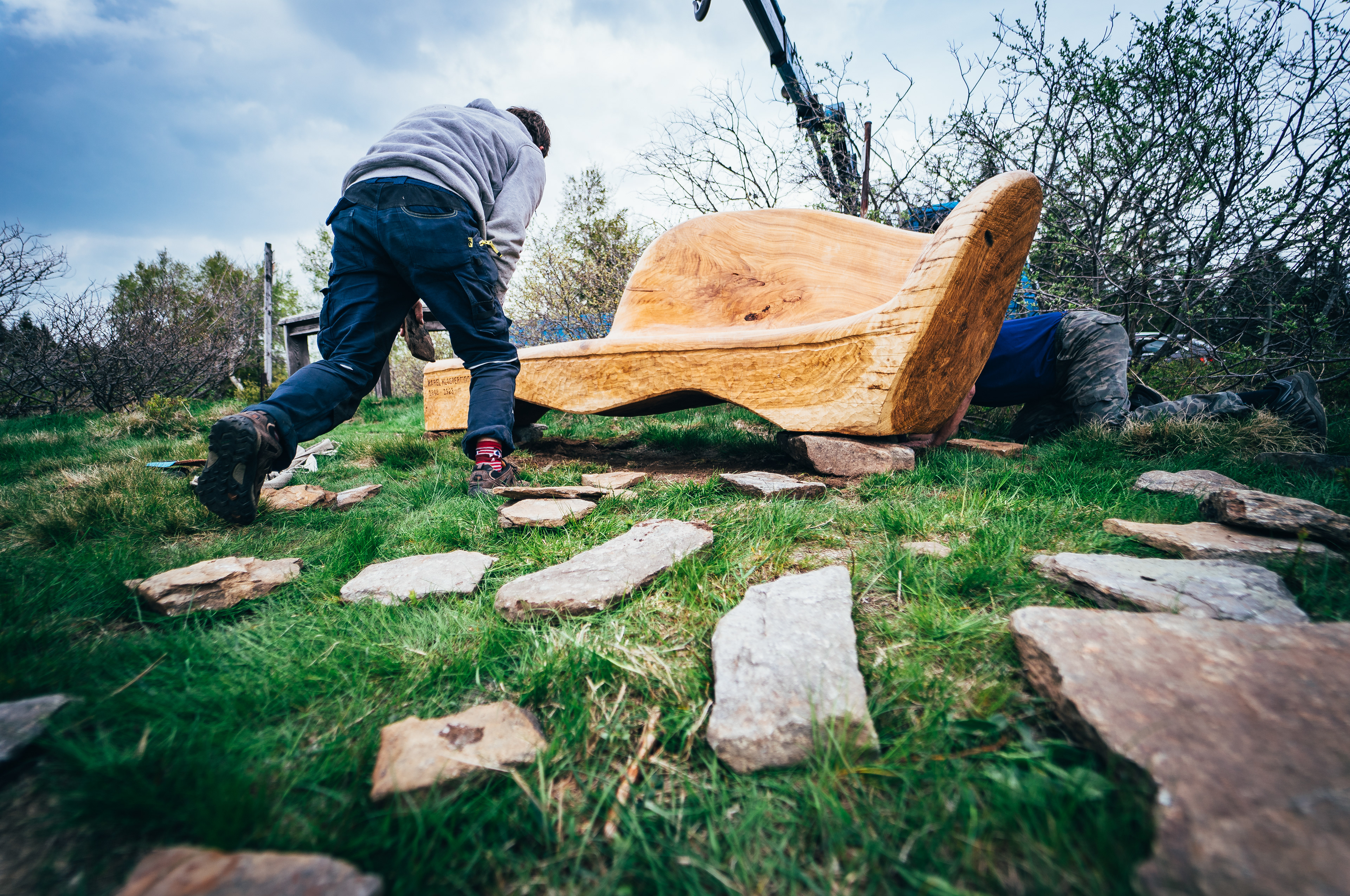 Na konci května došlo k převozu lavičky a instalaci. Bylo to náročné ale vše se podařilo. Lavička váží něco přes 1000kg a vejde se na ní až 5 lidí. Na louce na Zhůří jsme posbírali pár kamenů, které pod lavičkou vytvořili jakousi přírodní dlažbu.