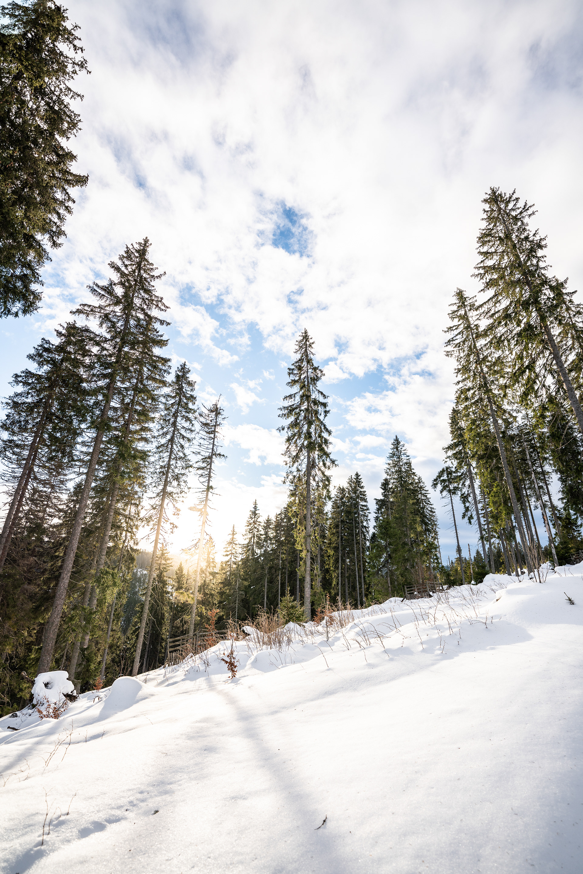 Na začátku je hned prudký kopec, ten jsem si se zátěží cca 10kg celkem vychutnal a po 1,5km v lehce vyšlapané trase si říkám, že bych vlastně už mohl nasadit sněžnice. Poprvé v životě. Ten správnej grif ještě musím poladit, ale celkem se mi ulevilo a zrychlil jsem tempo. Propadal jsem se cca 5 cm a šlo se fakt hezky. Pak ale přišla chvíle, kdy už to dotyčný přede mnou vzdal a otočil se, alespoň dle stop. Dál už žádné nevedly. Musel jsem si tedy cestu vyšlapávat sám a zde začal boj sám se sebou a s vůlí.