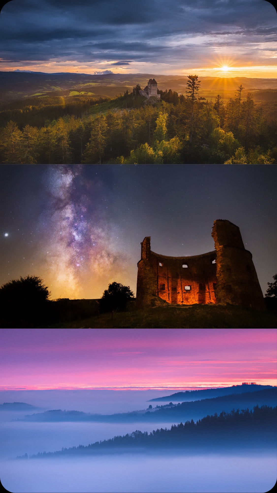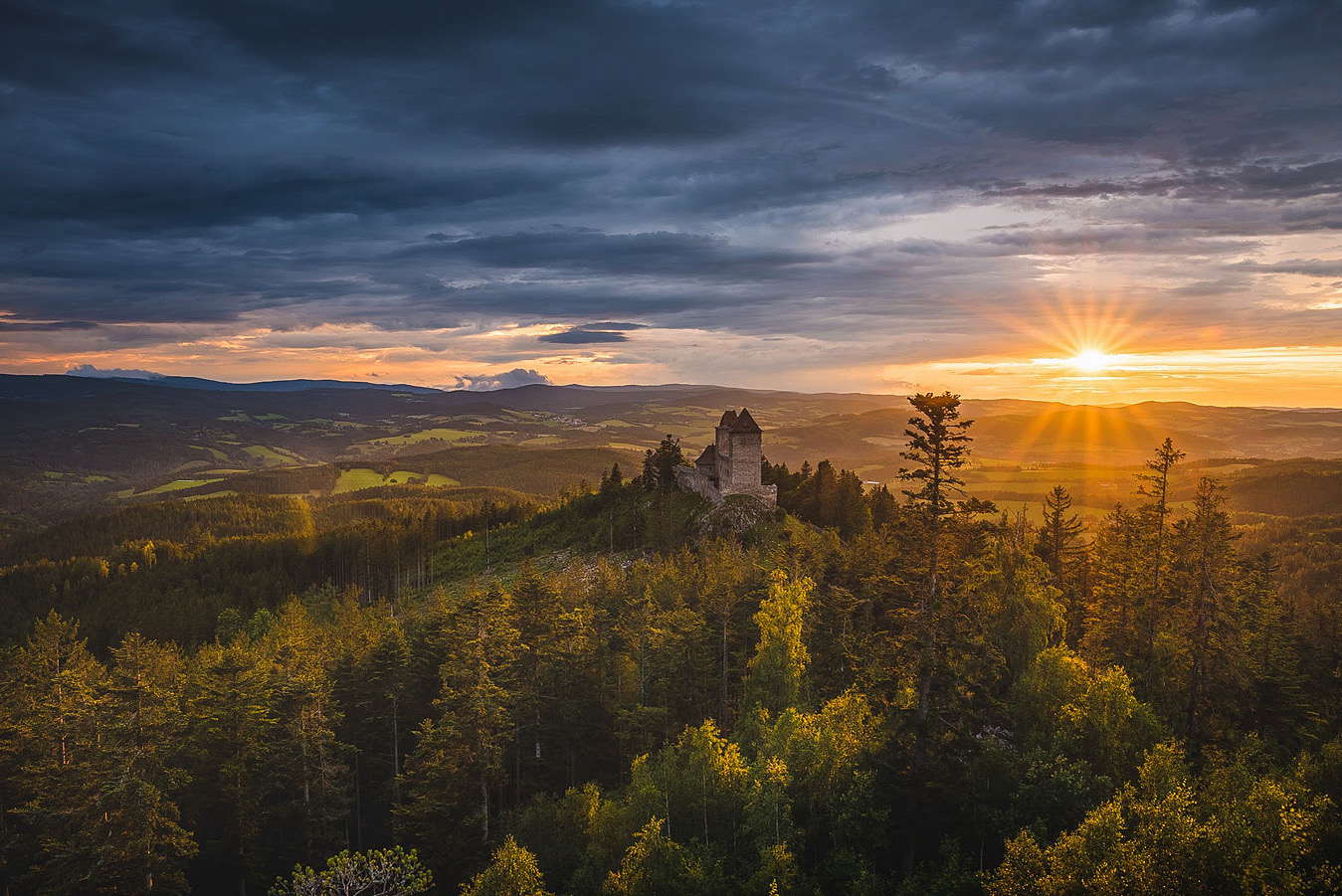 Chtěl bych vyfotit Kašperk s inverzí pod hradem při východu slunce, duhou na obloze, bleskem v popředí a jednorožcem mezi věžemi.